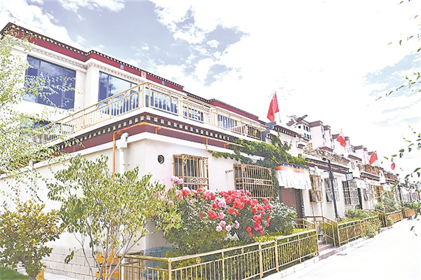 8月19日正午,拉薩市艷陽高照。毗鄰拉薩西站鐵路貨場的堆龍德慶區(qū)乃瓊鎮(zhèn)色瑪社區(qū)(以前為色瑪村),一排排藏式別墅規(guī)劃有序,一條條柏油馬路平整寬闊,家家戶戶的樓前國旗飄揚、鮮花盛放。